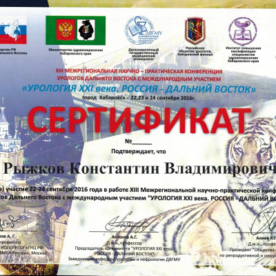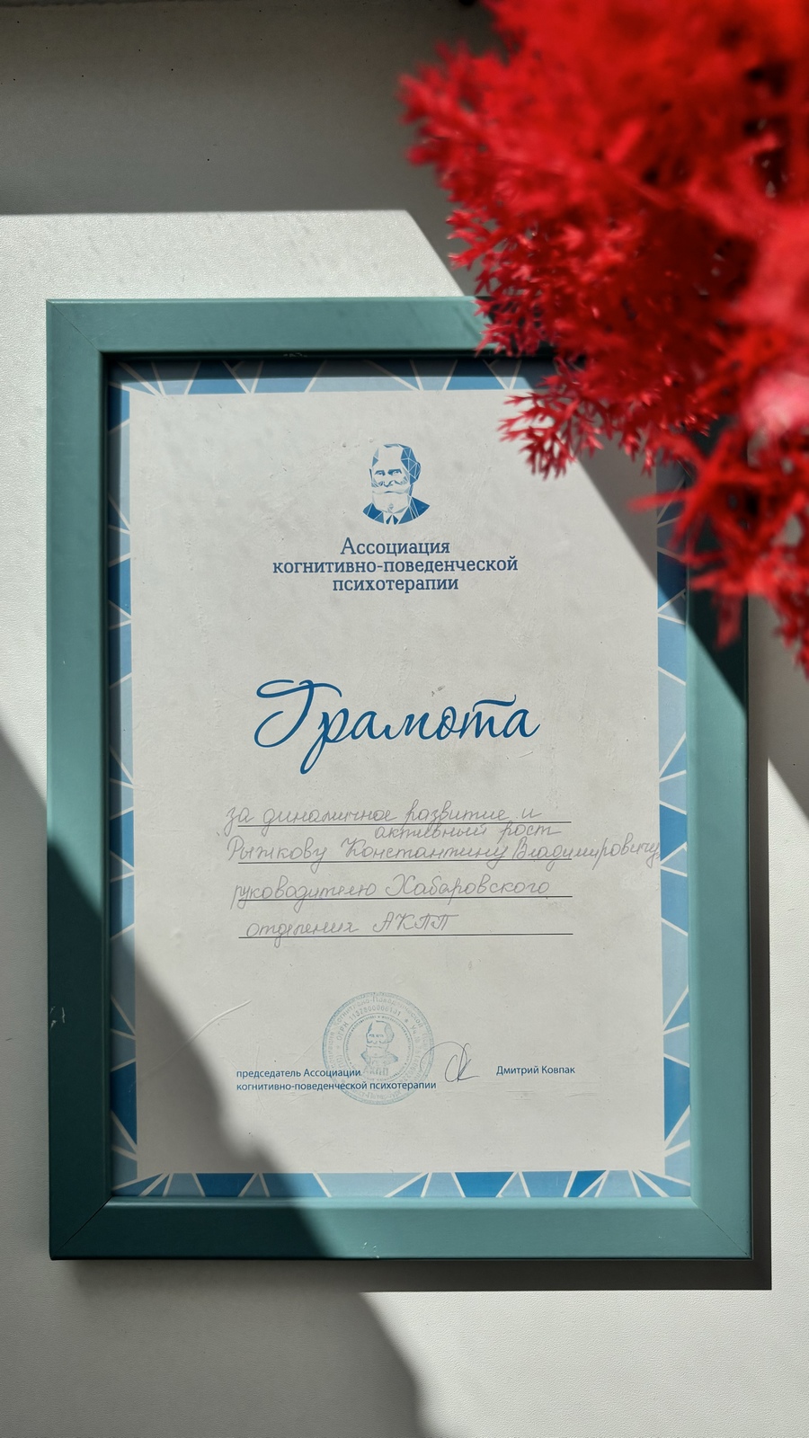 ● Грамота «За динамичное развитие и активный рост руководителю Хабаровского отделения Ассоциации Когнитивно-Поведенческой Психотерапии, 2016 г.