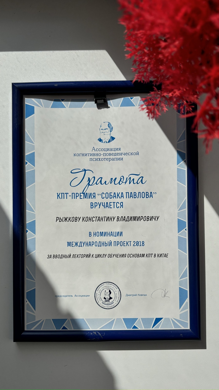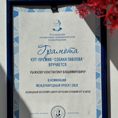 ● Премия «Собака Павлова» от Ассоциации Когнитивно-Поведенческой Психотерапии за международные проекты в 2018 г.